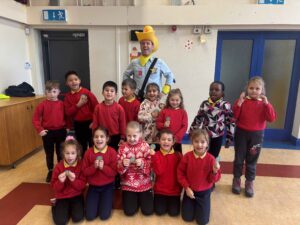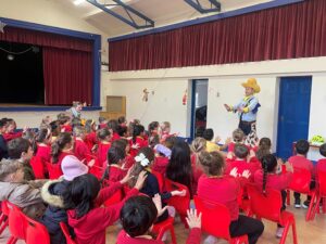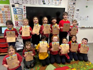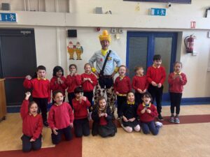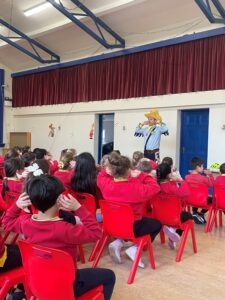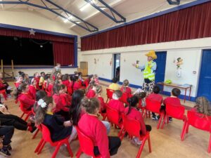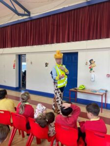 The first class boys and girls met The Seatbelt Sheriff last week and heard all about being safe when out walking or cycling and safety when in a car. The children got a Seatbelt Sheriff badge and certificate at the end of the workshop.