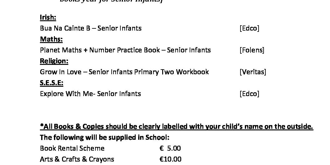 Senior Infant booklist for September 2022 Rooms 3 & 5